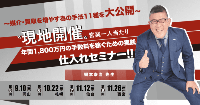 【兵庫県西宮市(現地開催)セミナー告知】2024年11月26日(火)開催|営業一人当たり年間1,800万円の手数料を 稼ぐための実践、仕入れセミナー|マンションリサーチ株式会社様