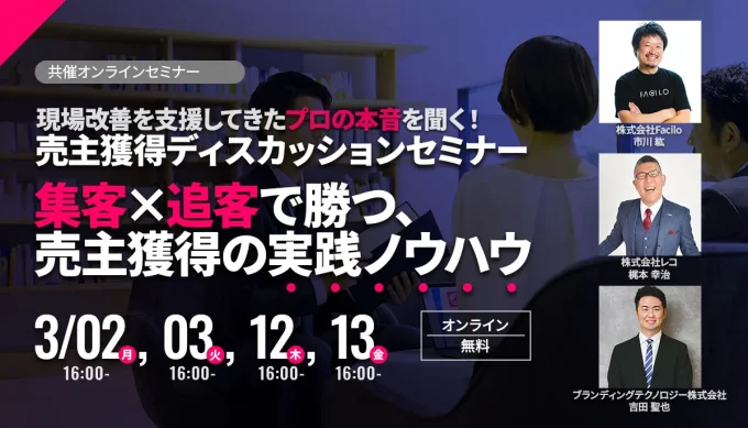 【オンラインセミナー告知】 2026年3月2日(月)開催 「現場改善を支援してきたプロの本音。売主獲得ディスカッションセミナー 集客×追客で勝つ売主獲得の実践ノウハウ」|株式会社Facilo様、ブランディングテクノロジー株式会社様主催